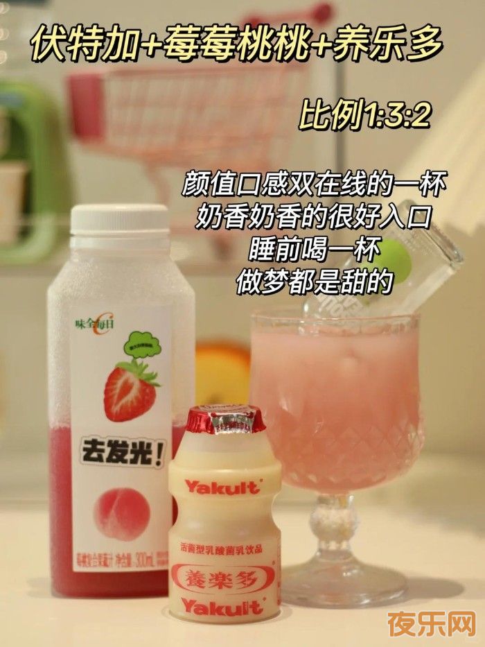 ①伏特加+莓莓桃桃+养乐多(比例1:3:2)